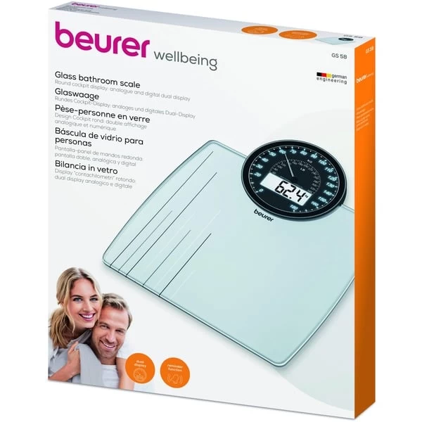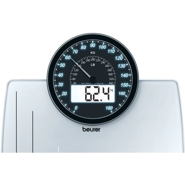 Die Personenwaage GS 58 von Beurer überzeugt im Cockpit-Design mit Glasoberfläche. Sie besitzt ein analoges und digitales Dual-Display. Die große LCD-Anzeige mit weißer Display-Beleuchtung und 26 mm Ziffernhöhe zeigt das Körpergewicht in kg bis maximal 180 kg an. Für vergleichbare Werte verfügt die Waage über einen akustischen Alarm 24 Stunden nach dem letzten Wiegen. Nach Gebrauch schaltet sich die Beurer GS 58 zudem automatisch aus.Art.-Nr.: 1349628