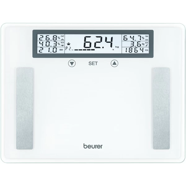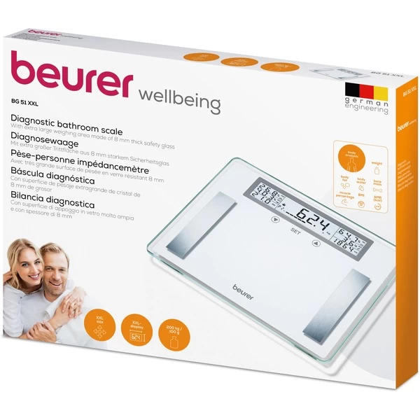Die Beurer Diagnosewaage BG 51 XXL ist mit einer großen Trittfläche aus extra starkem 8 mm Sicherheitsglas ausgestattet und eignet sich so besonders für schwergewichtige Personen. Sie hat einen Wägebereich bis 200 kg und speichert die Daten von bis zu zehn Personen. Diese Waage misst nicht nur das Gewicht mit einer Genauigkeit von 100 Gramm, sie gibt auch den Anteil von Körpergewicht, Körperfett, Körperwasser und Muskelmasse in Prozent der Gesamtmasse aus. Dazu wird der BMI und der Kalorienbedarf mithilfe der fünf Aktivitätsgrade errechnet. Art.-Nr.: 1349649