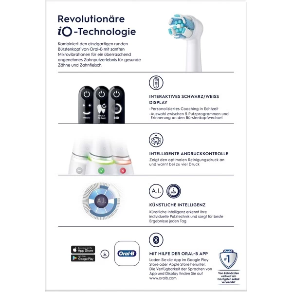 Die Braun Oral-B iO übertrifft alle Erwartungen an eine Zahnbürste mit einer unvorstellbaren Reinigungsleistung und einem sensationellen Mundgefühl. Das innovative, magnetische Antriebssystem der Oral-B iO liefert Energie punktgenau an die Borstenspitzen, die mit sanften Mikrovibrationen von Zahn zu Zahn gleiten, um ein effektives und angenehmes Putzerlebnis zu erzielen. So genießt man jeden Tag ein frisches Gefühl wie vom Zahnarzt! Die intelligente Andruckkontrolle warnt mit rotem Licht vor zu viel Druck und leuchtet grün, wenn der optimale Druck verwendet wird. Ein interaktives Display ermöglicht eine einfache Navigation durch die verschiedenen Funktionen und Einstellungen der Bürste. So wählt man zwischen verschiedenen Reinigungsmodi und erhält individualisiertes Coaching in Echtzeit sowie eine Erinnerung zum Bürstenkopfwechsel. Der visuelle Timer gibt Auskunft über die empfohlene Putzzeit von 2 Minuten. Die Zahnbürste begrüßt den Nutzer zudem am Morgen und schenkt nach dem Putzvorgang ein Lächeln für ausgezeichnete Ergebnisse. Die App bietet erstmals interaktive 3D-Grafiken, während die Oral-B iO dank künstlicher Intelligenz die individuelle Putztechnik erkennt. Mit der Braun Oral-B iO erlebt man Zahnputzerlebnis, das begeistert!Art.-Nr.: 1856682
