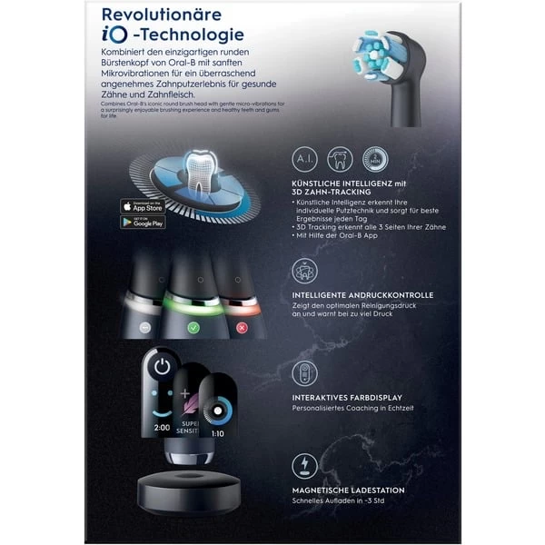 Die Braun Oral-B iO übertrifft alle Erwartungen an eine Zahnbürste mit einer unvorstellbaren Reinigungsleistung und einem sensationellen Mundgefühl. Das innovative, magnetische Antriebssystem der Oral-B iO liefert Energie punktgenau an die Borstenspitzen, die mit sanften Mikrovibrationen von Zahn zu Zahn gleiten, um ein effektives und angenehmes Putzerlebnis zu erzielen. So genießt man jeden Tag ein frisches Gefühl wie vom Zahnarzt! Die intelligente Andruckkontrolle warnt mit rotem Licht vor zu viel Druck und leuchtet grün, wenn der optimale Druck verwendet wird. Ein interaktives Display ermöglicht eine einfache Navigation durch die verschiedenen Funktionen und Einstellungen der Bürste. So wählt man zwischen verschiedenen Reinigungsmodi und erhält ein individualisiertes Coaching in Echtzeit sowie eine Erinnerung zum Bürstenkopfwechsel. Der visuelle Timer gibt Auskunft über die empfohlene Putzzeit von 2 Minuten. Die Zahnbürste begrüßt den Nutzer zudem am Morgen und schenkt nach dem Putzvorgang ein Lächeln für ausgezeichnete Ergebnisse. Die App bietet erstmals interaktive 3D-Grafiken, während die Oral-B iO dank künstlicher Intelligenz die individuelle Putztechnik erkennt. Mit der Braun Oral-B iO erlebt man Zahnputzerlebnis, das begeistert!Art.-Nr.: 1856571