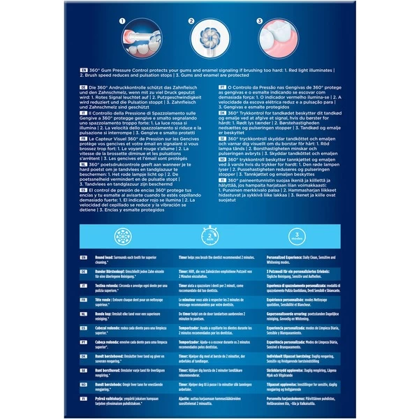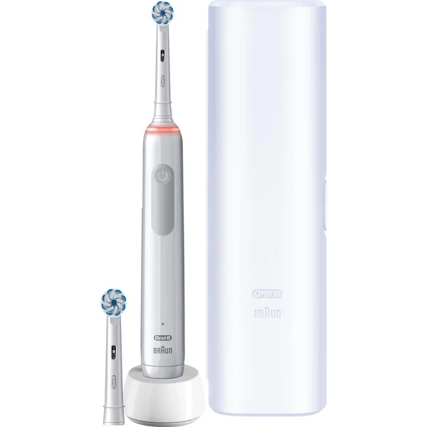Die Braun Oral-B Pro 3 3500 hilft dabei die Zähne wie vom Zahnarzt empfohlen zu putzen. Der integrierte Timer sorgt für die Einhaltung der empfohlenen Putzdauer von 2 Minuten und benachrichtigt alle 30 Sekunden, den Putzbereich zu wechseln. Während man einfach nur die Zahnbürste im Mund bewegt, erledigt der einzigartige runde Bürstenkopf von Oral-B den Rest. Er entfernt bis zu 100% mehr Plaque als eine herkömmliche Handzahnbürste, sorgt so für gesünderes Zahnfleisch und hellt das Lächeln ab dem ersten Tag der Anwendung durch Entfernen von Oberflächenverfärbungen auf. Die Zahnbürste verfügt außerdem über eine visuelle 360°-Andruckkontrolle. Sie leuchtet rot auf und reduziert die Putzgeschwindigkeit, wenn man zu viel Druck ausübt. Die Oral-B Pro 3 3500 eignet sich hervorragend für alle, die auf eine elektrische Zahnbürste umsteigen möchten, um ihre Mundgesundheit zu verbessern.Art.-Nr.: 1856362