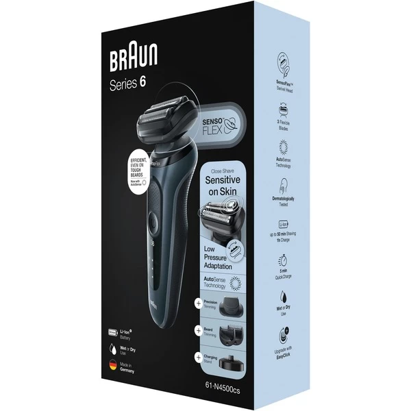 Der Braun Series 6 61-N4500cs Rasierer sorgt für eine gründliche und zugleich sanfte Rasur dank des dermatologisch getesteten, beweglichen SensoFlex-Scherkopfes und SensoFoil-Klingen, die eine Druckanpassung ermöglichen. Durch das EasyClick-System kann der Rasierer mit einem einfachen Klick umgerüstet werden. Die Aufsätze für verschiedene Pflegebedürfnisse können leicht ausgetauscht werden. Im Lieferumfang enthalten ist ein EasyClick Barttrimmer-Aufsatz für das Trimmen von Bärten von 0,5 bis 7 mm. Der integrierte Lithium-Ionen-Akku ermöglicht ein Rasieren von bis zu drei Wochen (50 Minuten Akkulaufzeit) und eine fünfminütige Schnellladung, die für eine Anwendung reicht. Der Braun Series 6 ist dank Wet&Dry Technologie 100% wasserdicht und für die Nass- und Trockenrasur geeignet. Auch die Verwendung mit Schaum oder Gel stellt kein Problem dar.Art.-Nr.: 1856612