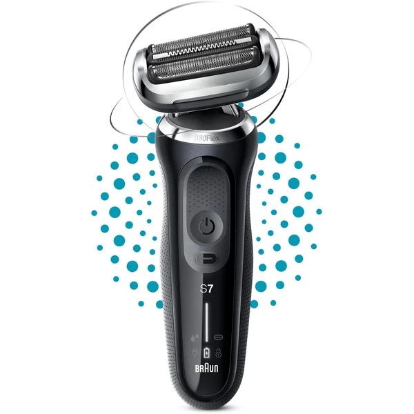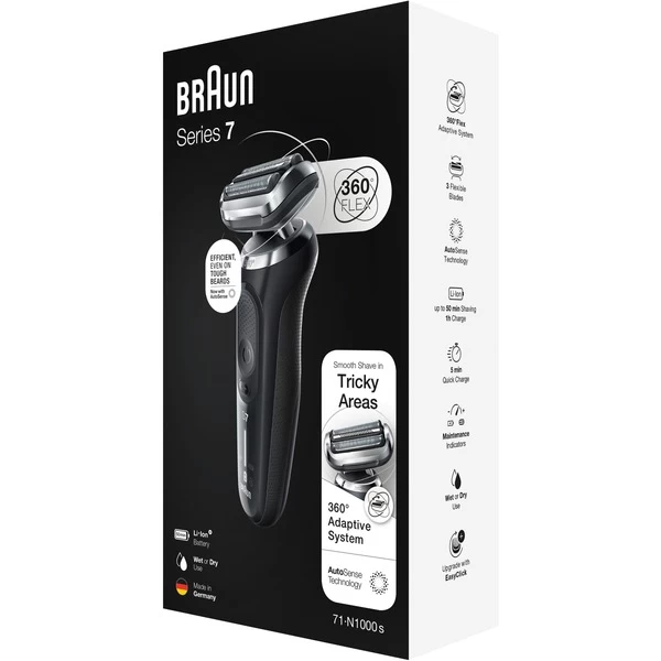 Der Braun Series 7 71-N1000s Rasierer mit 360-Grad-Anpassung und unabhängig voneinander beweglichen Rasierelementen sorgt für eine gründliche Rasur – sogar an schwer erreichbaren Stellen. Die Bartdichte wird automatisch erkannt und die Motorleistung durch die AutoSense-Technologie angepasst, um mit jedem Zug noch mehr Haare zu entfernen. Durch das EasyClick-System kann der Rasierer mit einem einfachen Klick umgerüstet werden. Die Aufsätze für verschiedene Pflegebedürfnisse können leicht ausgetauscht werden. Der integrierte Lithium-Ionen-Akku ermöglicht ein Rasieren von bis zu drei Wochen (50 Minuten Akkulaufzeit) und eine fünfminütige Schnellladung, die für eine Anwendung reicht. Der Braun Series 7 ist dank Wet&Dry Technologie 100% wasserdicht und für die Nass- und Trockenrasur geeignet. Auch die Verwendung mit Schaum oder Gel stellt kein Problem dar.Art.-Nr.: 1856640