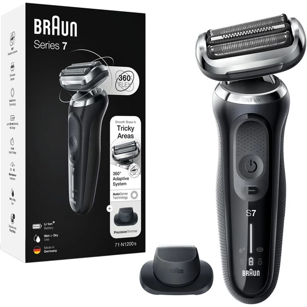 Der Braun Series 7 70-N1200s Rasierer mit 360-Grad-Anpassung und unabhängig voneinander beweglichen Rasierelementen sorgt für eine gründliche Rasur – sogar an schwer erreichbaren Stellen. Die Bartdichte wird automatisch erkannt und die Motorleistung durch die AutoSense-Technologie angepasst, um mit jedem Zug noch mehr Haare zu entfernen. Durch das EasyClick-System kann der Rasierer mit einem einfachen Klick umgerüstet werden. Die Aufsätze für verschiedene Pflegebedürfnisse können leicht ausgetauscht werden. Der integrierte Lithium-Ionen-Akku ermöglicht ein Rasieren von bis zu drei Wochen (50 Minuten Akkulaufzeit) und eine fünfminütige Schnellladung, die für eine Anwendung reicht. Der Braun Series 7 ist dank Wet&Dry Technologie 100% wasserdicht und für die Nass- und Trockenrasur geeignet. Auch die Verwendung mit Schaum oder Gel stellt kein Problem dar.Art.-Nr.: 1856386