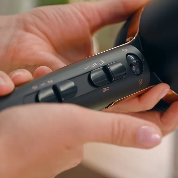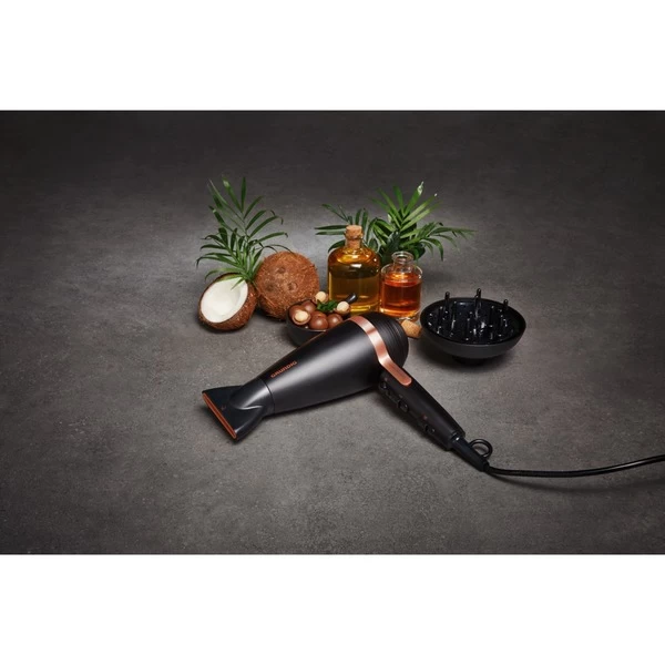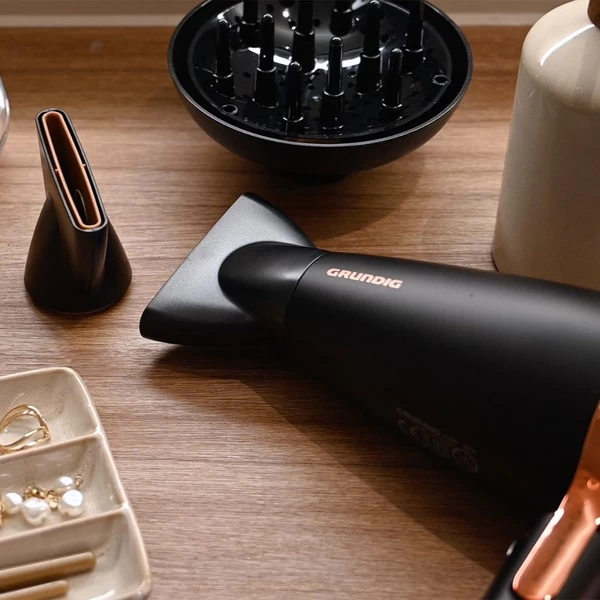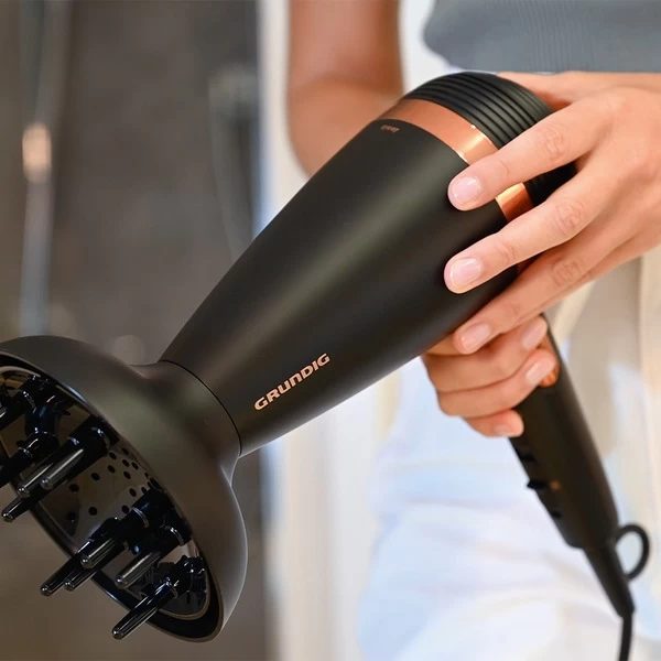 Der HD 8080 NaturaShine Haartrockner von Grundig mit langlebigem und leistungsstarkem (2200 Watt) Profi AC-Motor bietet 3 Heiz- und 2 Gebläsestufen. Der zusätzliche Turbo-Modus trocknet das Haar besonders schnell, während die Kaltstufe das Haar festigt und stabilisiert. Die Ionic-Funktion ist der Garant für antistatische, geschmeidig glänzende Haare, weil sie die Vitalität und die Sprungkraft des Haares erhält und für eine natürliche Hydratisierung der Haarstruktur sorgt. Besonderen Schutz und Pflege erhalten die Haare durch eine schonende Keramikbeschichtung mit Macadamia- und Kokosöl – das Haar ist hydratisiert und erhält so einen gesunden Glanz. Im Lieferumfang enthalten sind zwei Cool Touch Stylingdüsen in verschiedenen Größen, bei denen die Oberfläche während des Betriebs nicht überhitzt und ein Volumen-Diffusor, der natürlichen Schwung in gewelltes und Volumen in feines Haar bringt sowie für Stand am Haaransatz sorgt. Der am Griff integrierte Smart On/Off Sensor ermöglicht das automatische Ein- und Ausschalten des Haartrockners. Das abnehmbare, leicht zu reinigende Lufteinlassgitter und eine Aufhängeöse sorgen außerdem für eine komfortable Handhabung und Reinigung.Art.-Nr.: 1839950