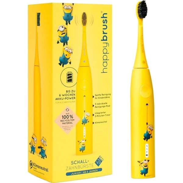 Die neue klimaneutrale Schall-Zahnbürste Eco VIBE 3 in der Minions Edition reinigt mit bis zu 40.000 hoch-effektiven Vibrationen und 3 individuellen Reinigungs-Modi. Der leistungsstarker Power-Akku hält bis zu 6 Wochen und ist bereit für jedes Reiseabenteuer. Hochwertige Aufsteckbürsten mit verblassenden Triple-Borsten zeigen den Wechselzeitpunkt an. Ein eingebauter intelligenter Timer hilft, die empfohlenen 2 Minuten einzuhalten und alle Quadranten gleichmäßig zu putzen. Die Travel-Lock-Funktion ist praktisch für unterwegs.