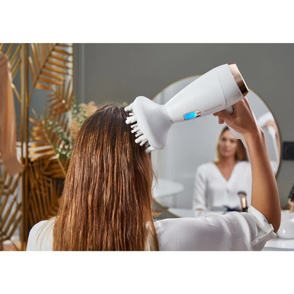 Gesünderes Haar, außergewöhnliches Trocknen und eine sanfte Kopfmassage: Der Rowenta Ultimate Experience CV 9240 Massage-Haartrockner sorgt für ein verbessertes Erlebnis mit sanfter Kopfmassage, um dem Haar den Look und die Pflege zukommen zu lassen, die es verdient. Der Active Scalp Revitalizer-Aufsatz sorgt für zusätzlichen Genuss beim Trocknen mit sanft rotierenden Fingern, die die Durchblutung anregen, um das Haar gesund zu halten und mit leichten Vibrationen das Haar an der Wurzel anzuheben, um ihm mehr Fülle zu verleihen. Zusätzlich zur Verwöhnung bietet der Haartrockner cleveres Design und kompromisslose Leistung – Haartrocknen mit 2200 W Leistung und einem langlebigen Digitalmotor für hervorragende Ergebnisse. Das kompakte, faltbare Format bietet höchsten Komfort – zu Hause ebenso wie auf Reisen. Die Advanced-Care-Einstellung sorgt zusammen mit der Ionen-Booster-Technologie für gesundes, geschmeidiges und glänzendes Haar.Art.-Nr.: 1767867